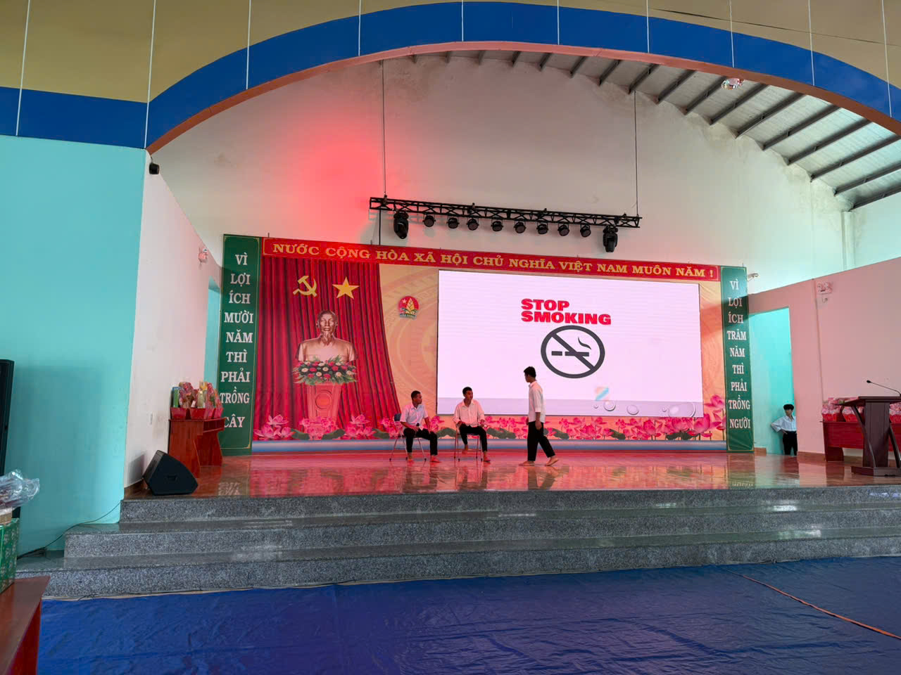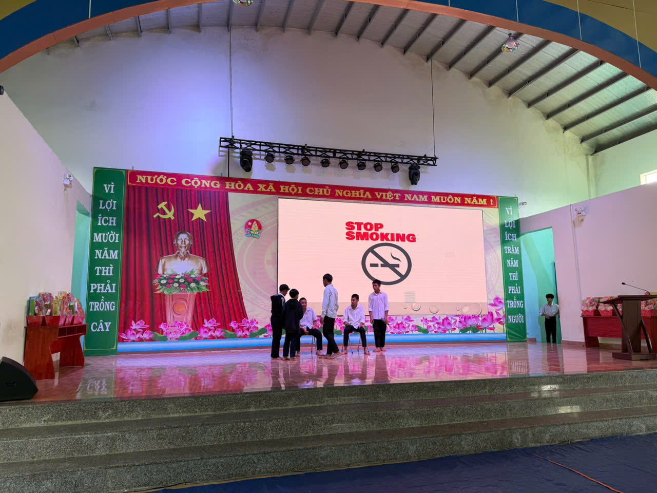 Tiếp theo, đại diện ban tổ chức tuyên bố lý do và giới thiệu ý nghĩa của hoạt động. Thông qua đoạn video tuyên truyền về tác hại của thuốc lá, học sinh được cung cấp những kiến thức trực quan, sinh động về ảnh hưởng tiêu cực của khói thuốc đối với sức khỏe con người, đặc biệt là lứa tuổi thanh thiếu niên. Nội dung video giúp các em hiểu rằng không chỉ người hút thuốc mà cả những người xung quanh cũng chịu tác động nghiêm trọng.
